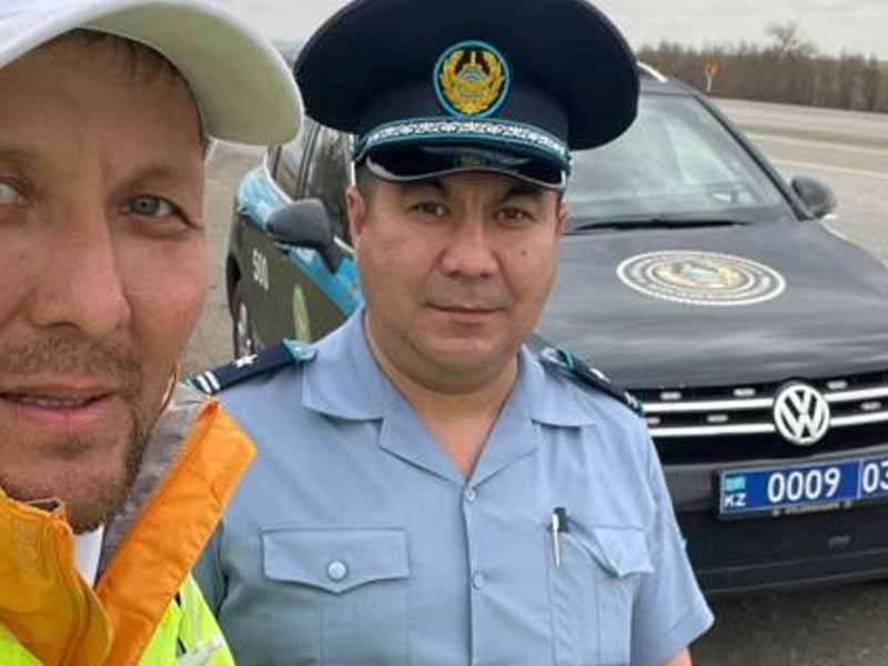 Во время пути по республиканской трассе «Астана – Петропавловск» мужчина встретил экипаж акмолинской полиции. Увидев одинокого путника на дороге, сотрудники полиции во главе с командиром батальона Ерланом Дарбаевым проявили внимание и заботу о его безопасности. Стражи порядка подарили путешественнику светоотражающий жилет, который не только делает пешехода заметным для водителей в тёмное время суток и в условиях плохой видимости, но и может защитить от дождя в непогоду.